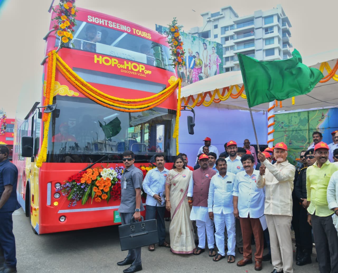 CM Chandrababu : విశాఖపట్నం – హాప్ ఆన్ హాప్ ఆఫ్ బస్సులను ప్రారంభించారు ముఖ్యమంత్రి చంద్రబాబు నాయుడు. ఆర్కే బీచ్ నుంచి తొట్ల కొండ వరకూ బీచ్ రోడ్ లో పర్యాటక బస్సులు నడుస్తాయి. విశాఖ బీచ్ రోడ్డులో డబుల్ డెక్కర్ బస్సులను జెండా ఊపి ప్రారంభించారు. మొత్తం 16 కిలోమీటర్ల మేర పర్యాటక ప్రాంతాల్లో తిరగనున్న ఎలక్ట్రిక్ డబుల్ డెక్కర్ బస్సులు . ఈ బస్సులో ప్రజాప్రతినిధులతో కలిసి ప్రయాణించారు చద్రబాబు నాయుడు (CM Chandrababu). ఆర్కే బీచ్ నుంచి బీచ్ రోడ్డు మీదుగా జర్నీ చేశారు. ఈ సందర్బంగా పర్యాటకులకు అభివాదం చేశారు. 24 గంటల పాటు ప్రయాణించేలా టికెట్ ఛార్జీని రూ.500 పెట్టారని తెలిపారు.