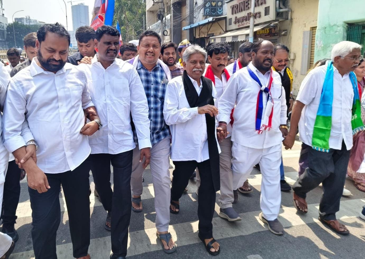 Manda Krishna Madiga : హైద‌రాబాద్ : త‌మ న్యాయ ప‌ర‌మైన రిజ‌ర్వేష‌న్ల సాధ‌న కోసం బీసీలు క‌దం తొక్కారు. బీసీ జేఏసీ ఆధ్వ‌ర్యంలో ఈనెల 18న శ‌నివారం రాష్ట్ర వ్యాప్తంగా జ‌స్టిస్ ఫ‌ర్ బీసీ బంద్ కు పిలుపునిచ్చింది. ఈ సంద‌ర్బంగా రేప‌టి బంద్ ను విజ‌య‌వంతం చేయాల‌ని కోరుతూ హైద‌రాబాద్ లో భారీ ర్యాలీ చేప‌ట్టారు. ఈ ర్యాలీలో తెలంగాణ జ‌న స‌మితి పార్టీ చీఫ్ ప్రొఫెస‌ర్ కోదండ‌రాం రెడ్డి, ఎంఆర్ఎస్ జాతీయ అధ్య‌క్షుడు మంద‌కృష్ణ మాదిగ‌ (Manda Krishna Madiga), ఎమ్మెల్సీ అద్దంకి ద‌యాక‌ర్ తో పాటు బీసీ అగ్ర నేత లింగం గౌడ్ , త‌దిత‌రులు పాల్గొన్నారు.