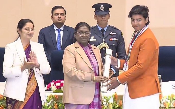 న్యూఢిల్లీ : బీహార్ కు చెందిన క్రికెట్ చిచ్చర పిడుగు వైభవ్ సూర్యవంశీకి అరుదైన పురస్కారం దక్కింది. శుక్రవారం రాష్ట్రపతి భవన్ లో జరిగిన కార్యక్రమంలో తను ప్రధాన్ మంత్రి రాష్ట్రీయ బాల్ పురస్కార్ అందుకున్నారు. ప్రతి ఏటా దేశ వ్యాప్తంగా ప్రతిభ , ధైర్యం, సాహసాలు ప్రదర్శించిన పిల్లలకు కేంద్రం అవార్డులను ఇస్తుంది. ఈ ఏడాది అద్భుతమైన ప్రతిభా నైపుణ్యాన్ని ప్రదర్శించాడు వైభవ్ సూర్యవంశీ. అత్యంత పిన్న వయసులోనే రికార్డుల మోత మోగిస్తున్నాడు. తాజాగా అరుణాచల్ ప్రదేశ్ తో జరిగిన విజయ్ హజారే ట్రోఫీ మ్యాచ్ లో వరల్డ్ రికార్డ్ నమోదు చేశాడు. 15 ఫోర్లు 16 సిక్సర్లతో ఊచకోత కోశాడు. దీంతో తను ఇప్పుడు టీనేజ్ క్రికెట్ సంచలనంగా మారాడు.